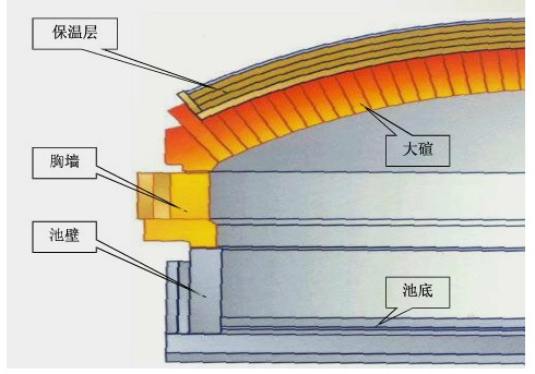 池壁保溫:用電熔鋯剛玉磚,AZS磚或致密鋯英石磚。
