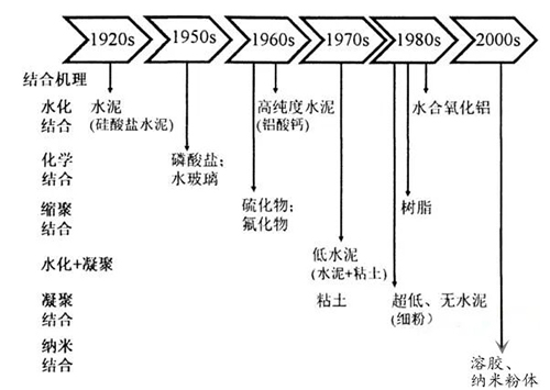 結合體系的組成和顯微結構決定耐火澆注料性能的優(yōu)劣。耐火澆注料的發(fā)展歷史也屬于結合劑的發(fā)展史。圖1示出了不定形耐火澆注料由水泥結合向著低水泥結合,超低水泥結合以及無水泥結合的方向發(fā)展。